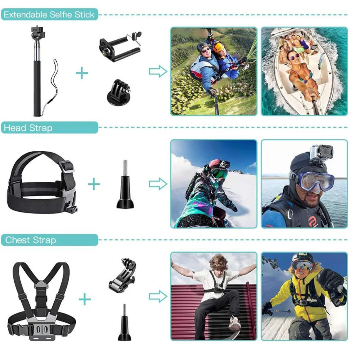 - Head Strap & Chest Strap: Designed for immersive first-person video and photos, these straps are fully adjustable and ensure comfort during vigorous activities.