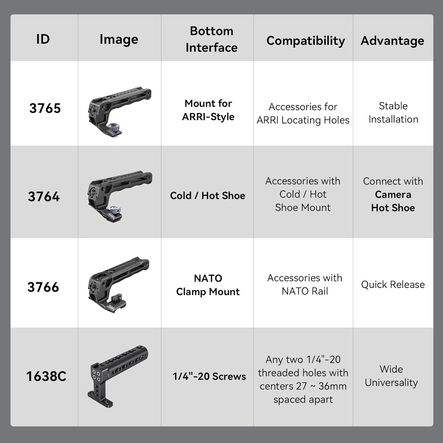 • NOTE: For the top handle of the Cold-shoe version, SMALLRIG 3764 must be purchased. For the top handle of the NATO0 version, SMALLRIG 3766 must be purchased.