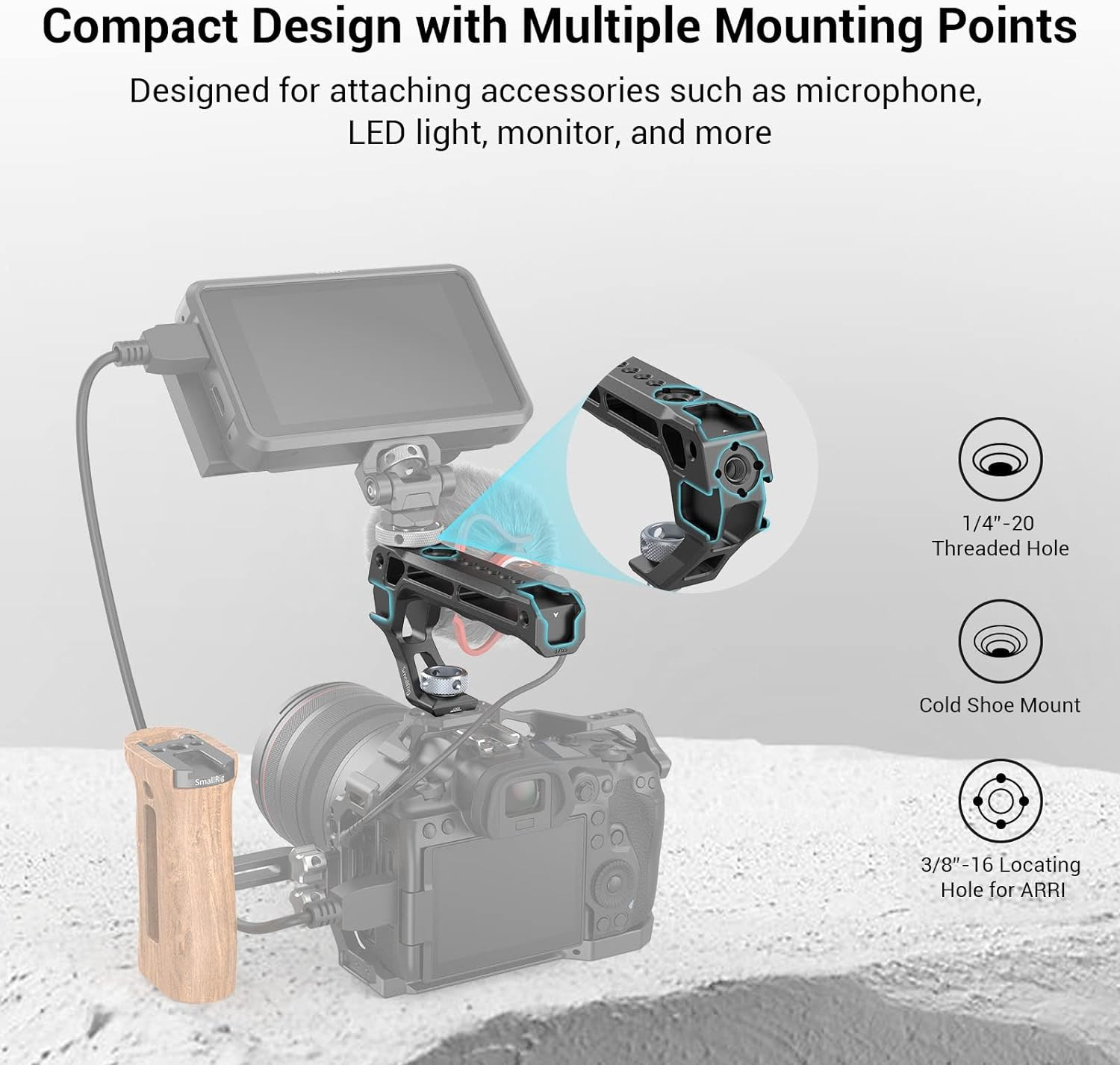 • Mounting Points: SMALLRIG Top Handle has an abundance of 1/4"-20 and 3/8"-16 attachment points for other accessories. An Allen key helps tighten the locking screw, making it easy to assemble and disassemble.