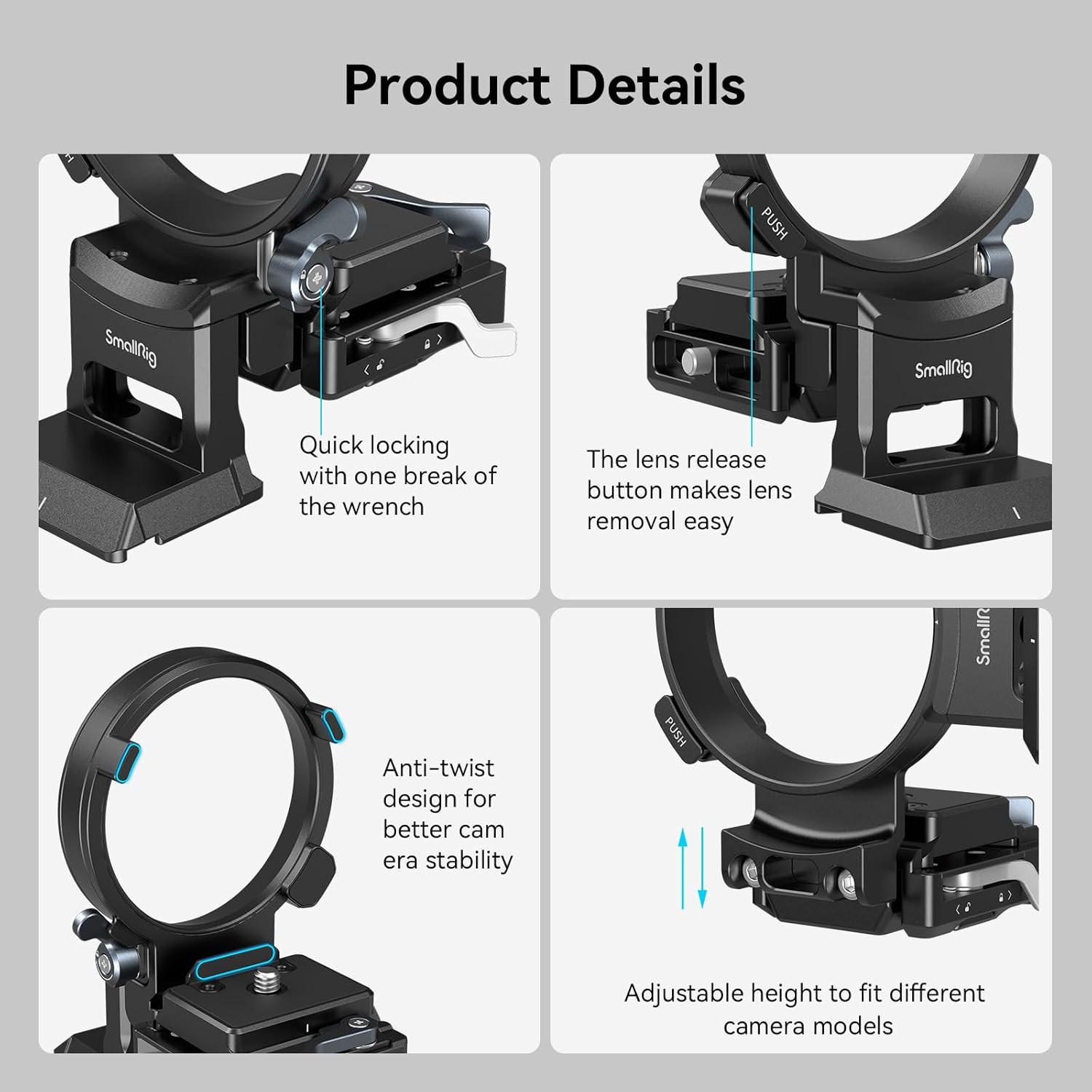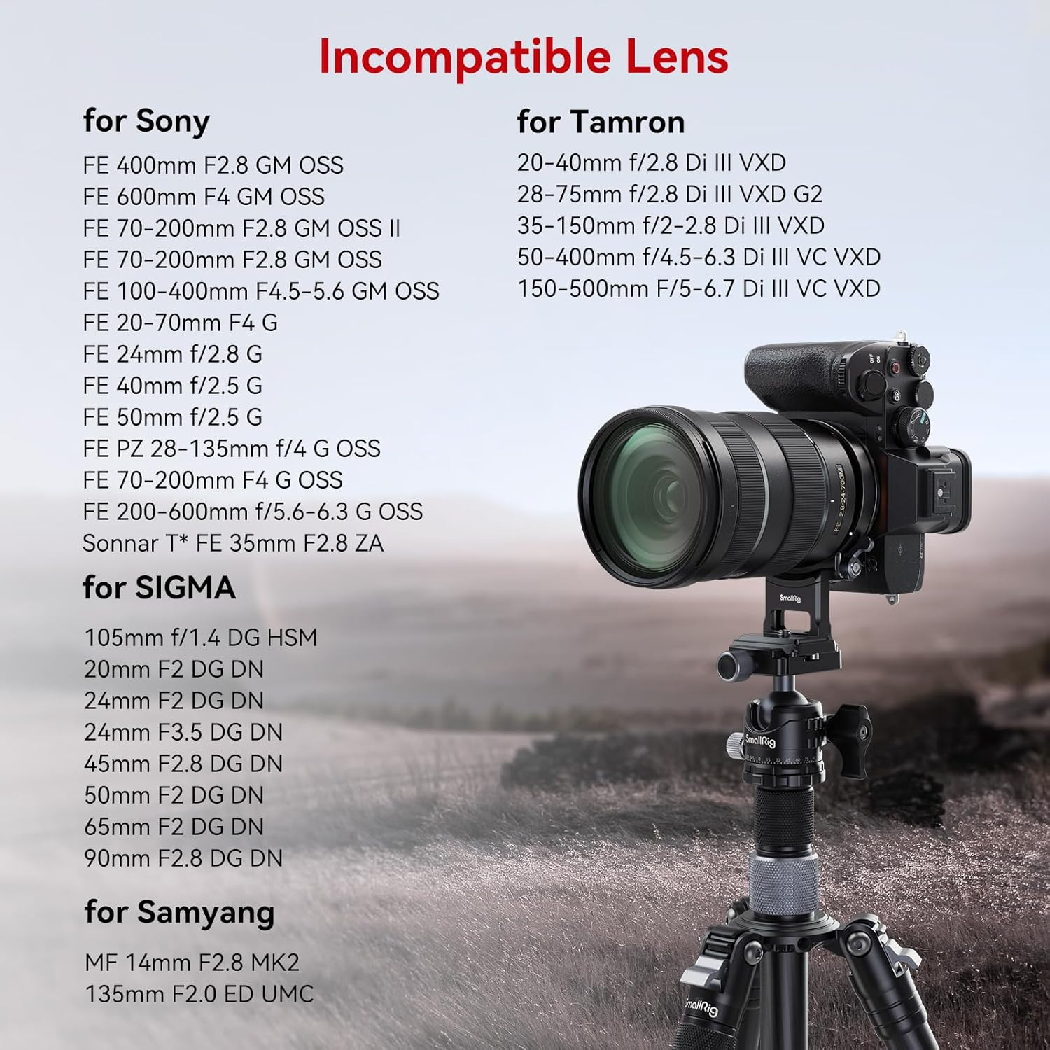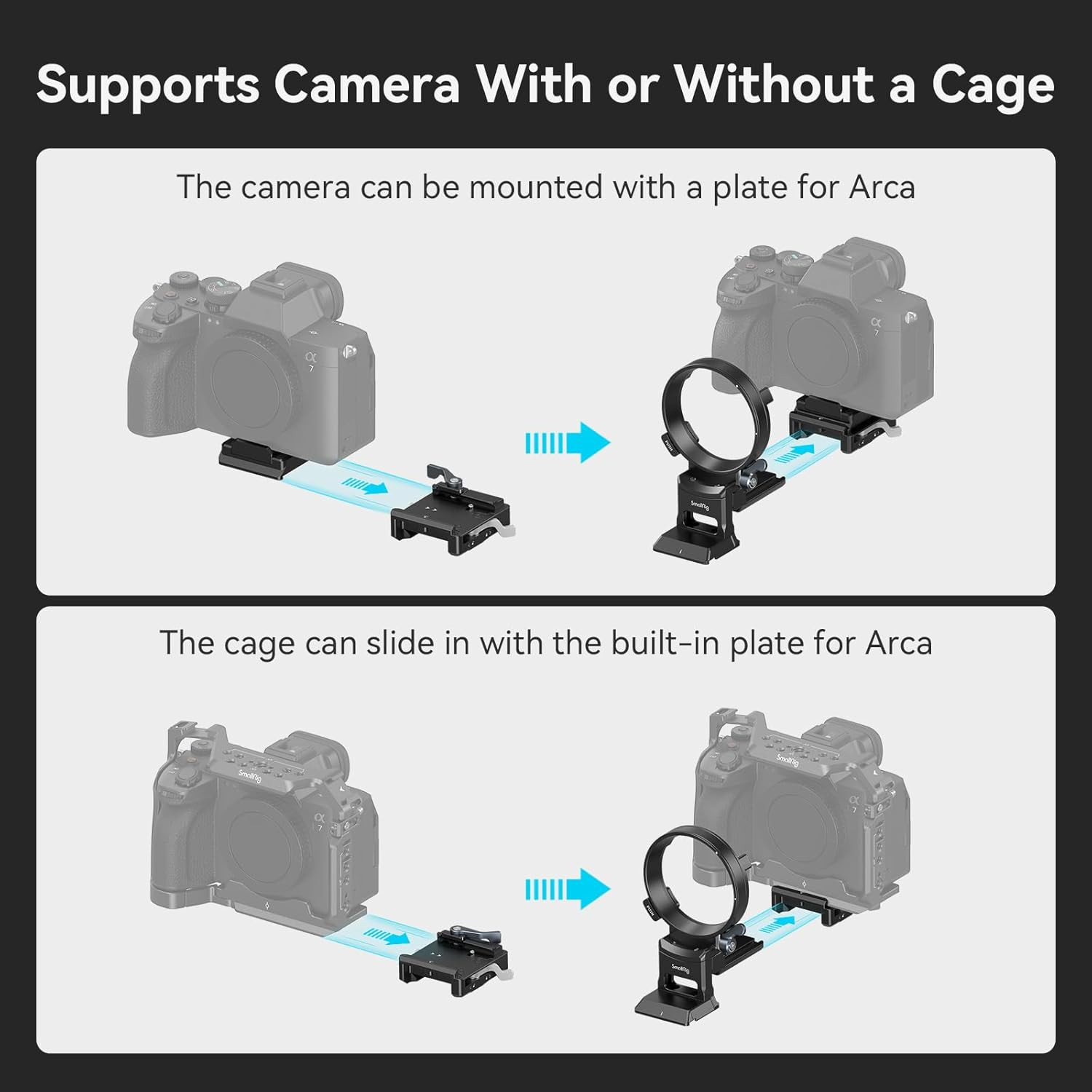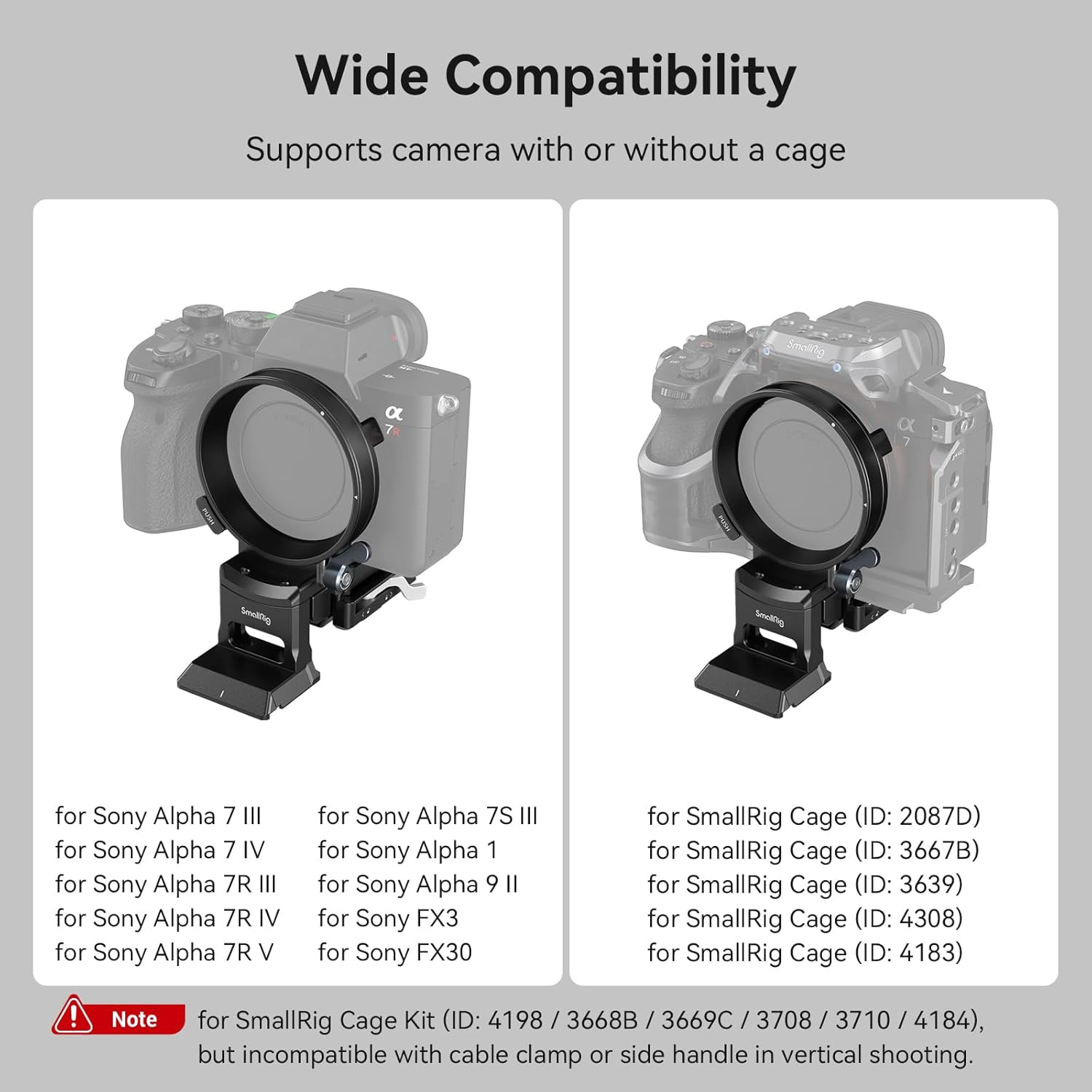 • Compatibility - SMALLRIG Swivel Collar Mounting Plate 4244 is designed for Sony Alpha 7 III / Alpha 7 IV / Alpha 7R III / Alpha 7R IV / Alpha 7R V / Alpha 7S III / Alpha 1 / Alpha 9 II / FX3 / FX30. It is also compatible with SMALLRIG Camera Cage (ID: 2087D / 3667B / 3639 / 4308 / 4183). The camera can be mounted with a plate for Arca, the cage can be inserted with the built-in plate for Arca.